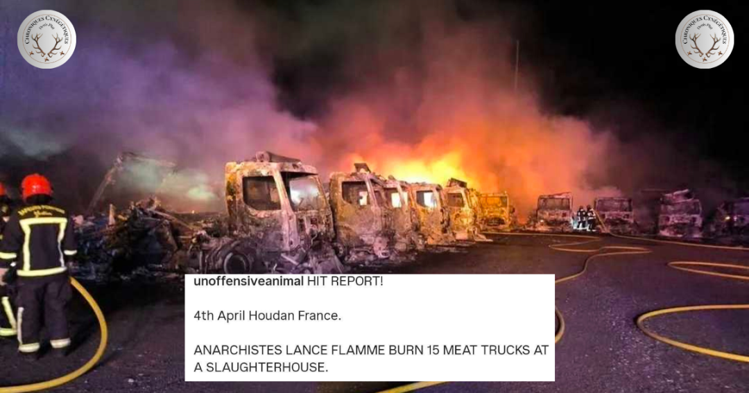 Dans la nuit du 4 au 5 avril 2026, un incendie1 a détruit la totalité des camions du groupe Paris Terroirs sur le parking des abattoirs de Houdan dans les Yvelines. C’est toute la flotte de véhicules de l’entreprise qui est entièrement partie en fumée, camions, camionnettes, rien n’a été épargné. Selon la gendarmerie, l'acte … Lire la suite de Un groupe antispéciste revendique l’incendie de 17 camions frigorifiques.