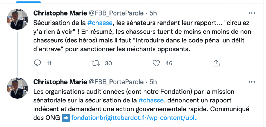 Nos opposants ont déjà réagi et sont furieux. Il faut souligner que le Sénat relance l’idée de créer un délit d’entrave au déroulement d’activités sportives ou de loisir légales. Un des pires, Christophe Marie, le porte-parole le la Fondation Brigitte Bardot vient de twitter :