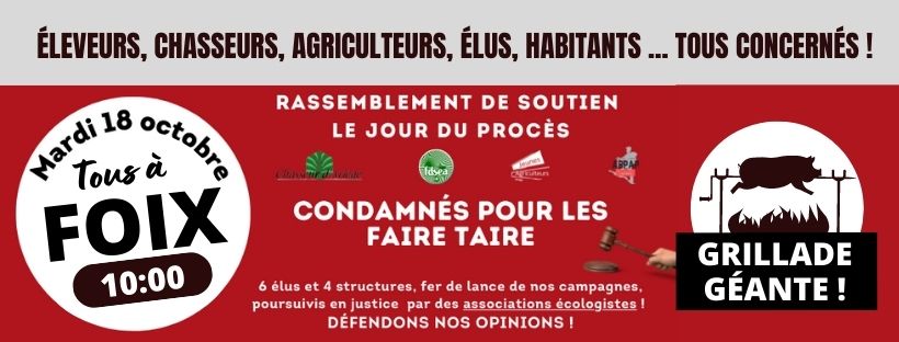 En réaction, la FDSEA, les Jeunes Agriculteurs, l’Association pour la Sauvegarde du Patrimoine d’Ariège-Pyrénées (ASPAP), la FDC 09 ont appelé à manifester le même jour devant le lieu de l’évènement. Les organisateurs du colloque prétendent avoir été victimes de violences et attaquent 6 personnes et 4 organisations au tribunal correctionnel pour atteinte à la liberté d’expression. Les peines peuvent être lourdes.