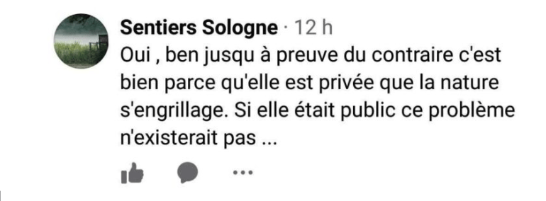 A l’origine, il y a le combat de quelque associations locales (solognotes pour les plus connues). Certaines militent honnêtement et légitimement pour la libre circulation de la grande faune. D’autres profitent de ce débat pour avancer leurs pions politiques contre « les grands propriétaires, les propriétés des patrons du CAC 40, la privatisation de la nature qui devrait être un bien commun… » On reconnait bien là la phraséologie typique de l’idéologie gauchiste qui les inspire. A titre d’exemple voici le commentaire d’une association trouvé sur Facebook.