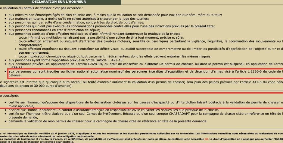 Les fédérations départementales de chasse n’ont pas la possibilité de consulter au préalable ce fichier mais elles ne peuvent imprimer et vous faire parvenir votre validation annuelle sans qu’un contrôle automatique n’ait été effectué et que le résultat soit négatif.