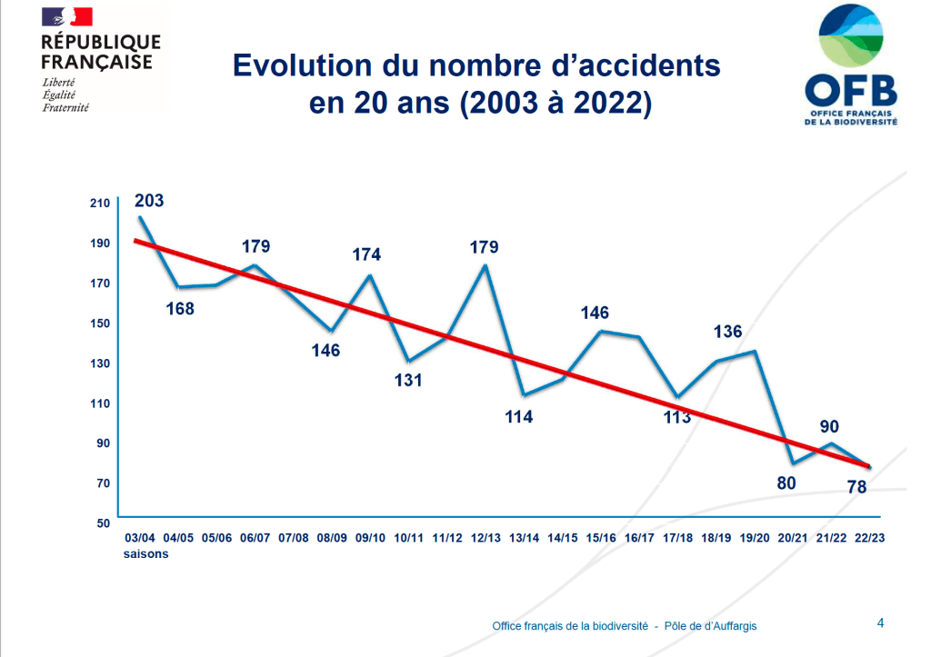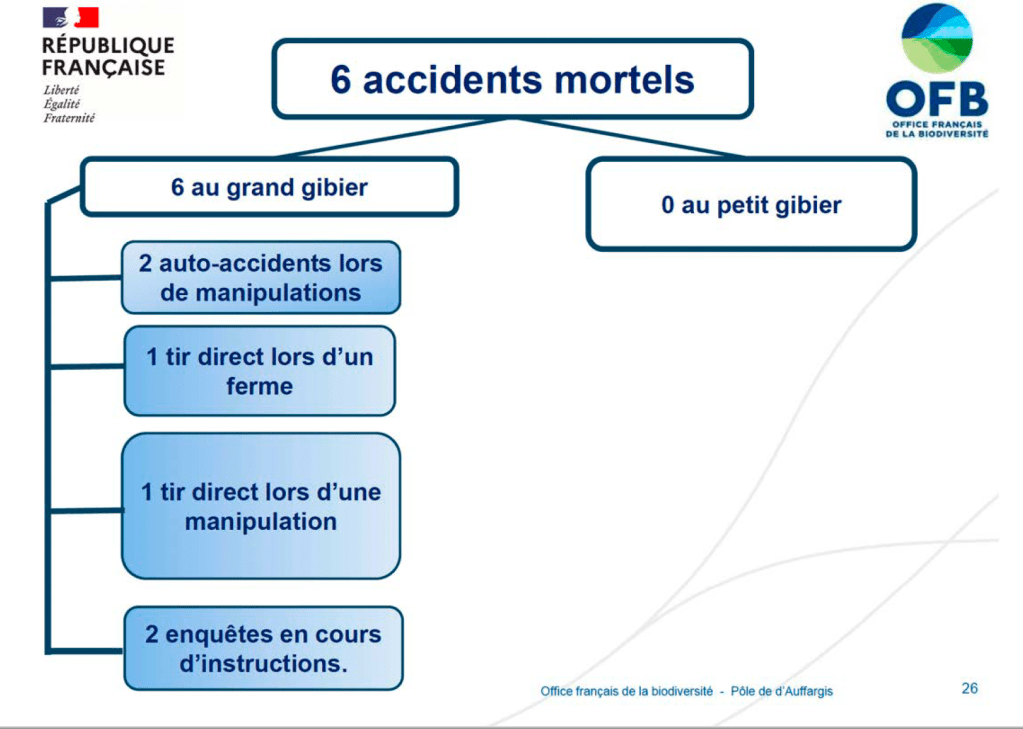 Jamais il n’y a eu aussi peu d’accidents et d’incidents de chasse (6 morts et 78 incidents). Le bilan de la saison passée pourrait donc être considéré comme bon. L’analyse détaillée faite par l’OFB doit néanmoins inciter à mesurer notre satisfaction tant les circonstances de certains accidents sont navrantes et stupides. Sur 6 accidents mortels, 4 auraient pu être évités en respectant les règles élémentaires de sécurité. Le seul bon point indiscutable est qu’aucun accident mortel impliquant un non chasseur n’est à déplorer.