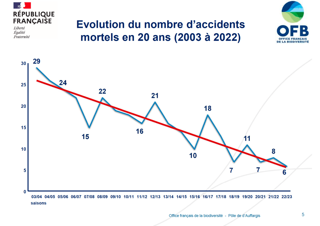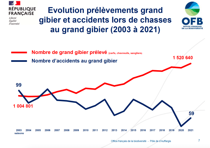 D’autant plus que la chasse la plus accidentogène est celle du grand gibier et que c’est celle dont la pratique a le plus progressé. En 20 ans le nombre de grands animaux prélevés a augmenté de 51% et les accidents en chasse du grand gibier ont baissé de 40%.