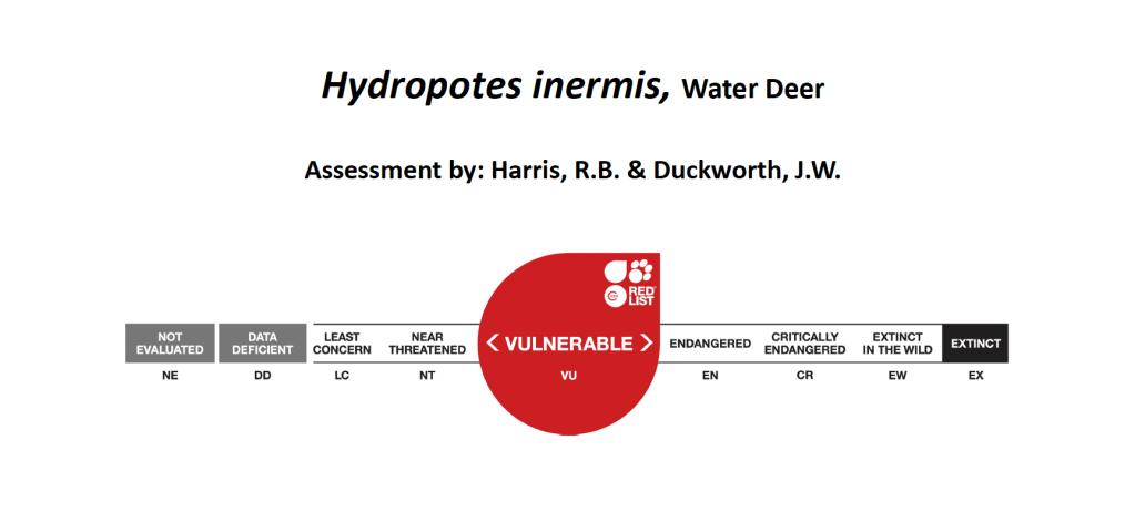 Il appartient à la troisième et dernière sous-famille de cervidés dont il est la seule espèce. On l’appelle aussi le cerf d’eau de Chine (Hydropotes inermis). Vous entendrez aussi beaucoup parler du « water deer » car c’est une espèce qui est assez présente chez nos amis anglais, nous verrons pourquoi un peu plus loin.