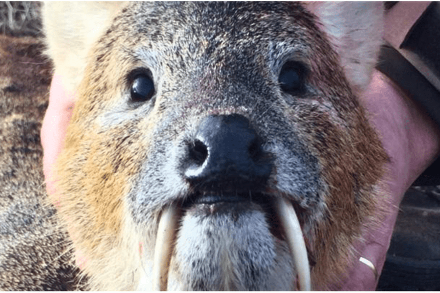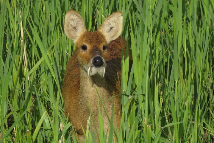 C’est, en effet, un cerf dont les mâles n’ont pas de bois. Il possède par contre de grandes canines qui dépassent de la mâchoire supérieure qui remplacent les bois pour les combats. On l’appelle aussi chevreuil des marais, cerf d’eau ou cerf vampire, il vit dans des zones humides où il se nourrit de végétaux aquatiques.