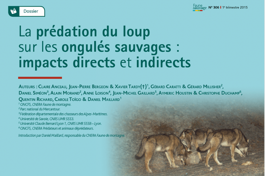 « La présence du loup sur notre territoire est à présent un élément important à prendre en compte pour une gestion raisonnée des populations de grands herbivores. Quel est son impact sur ces communautés d’ongulés, par ailleurs soumises à de multiples influences environnementales, anthropiques ou pathologiques ? La question est complexe, tant les mécanismes interactifs et compensateurs sont nombreux. C’est donc dans une vision holiste, à l’échelle de l’écosystème plutôt que de la population, que le programme d’étude « prédateur-proies » s’est inscrit pour appréhender le sujet, à partir du suivi fin de loups et d’ongulés marqués en parallèle et en se basant sur la comparaison de sites aux situations de prédation contrastées. » (Faune sauvage)