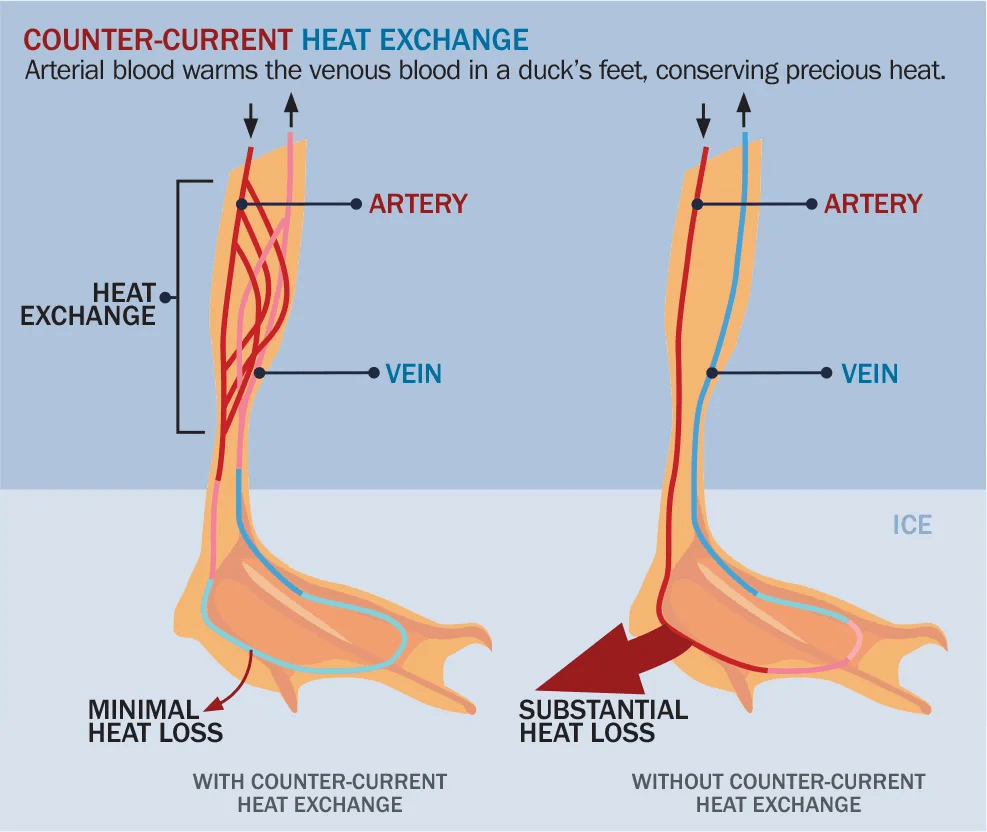 « L’artère et la veine d’un canard se touchent dans le tarse, l’os de la jambe au-dessus des articulations du pied s’étendant jusqu’à l’endroit où commencent leurs plumes », déclare le docteur Nicolai. « Lorsque le sang chaud quitte le corps, il réchauffe le sang froid (refroidi par le contact avec la glace et d’autres conditions extérieures) qui revient dans le corps depuis la jambe. La patte palmée du canard peut facilement supporter le froid, mais cela empêche le canard de choquer son corps avec les températures froides dues au retour du sang. »