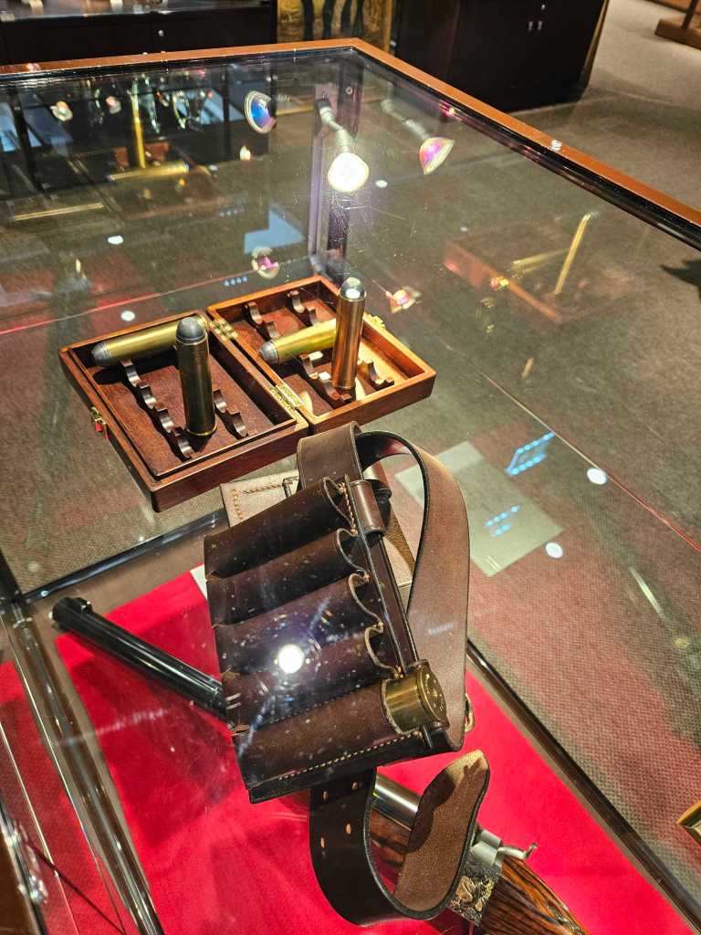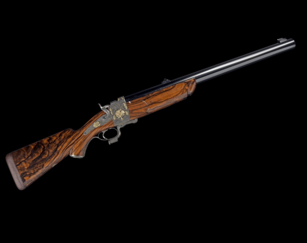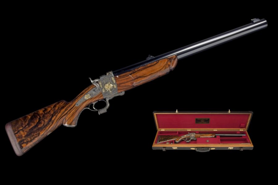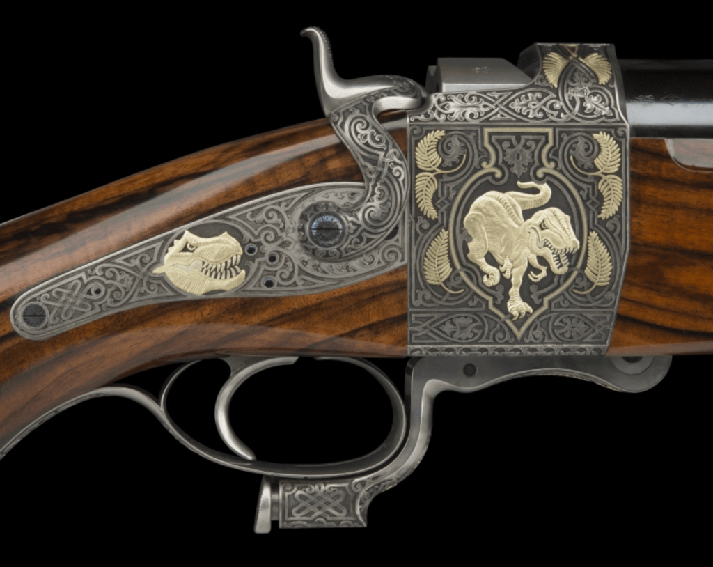 La crosse est faite d’un noyer exceptionnel et le mécanisme est décoré de profondes gravures rehaussées de fils d’or qui représentent un Tyrannosaurus Rex. La valise et l’étui à munitions avec laquelle est livrée l’arme sont, eux aussi, des pièces superbes.