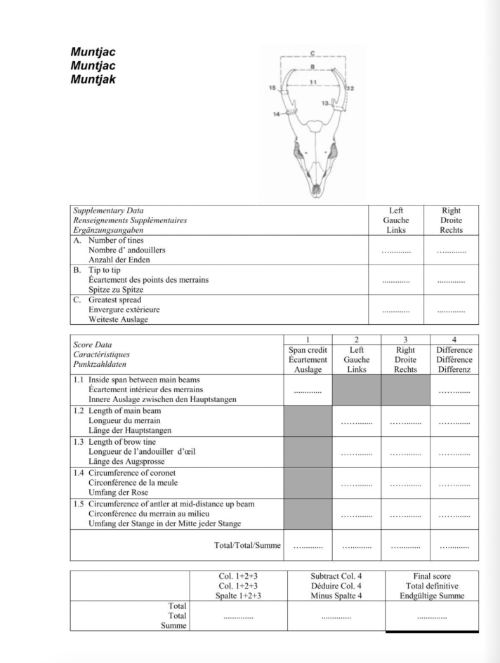 Unlike other cervid species, the trophy is not scored by measuring the volume, but by taking various measurements in centimetres. Points are awarded as follows :