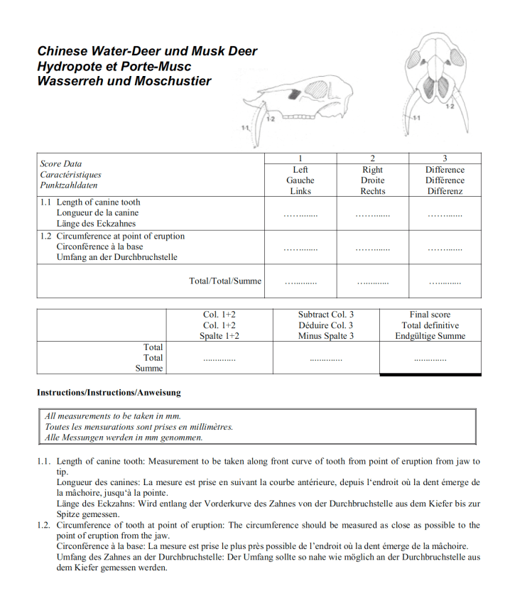 As it has no antlers, its canines are measured to evaluate its trophies.