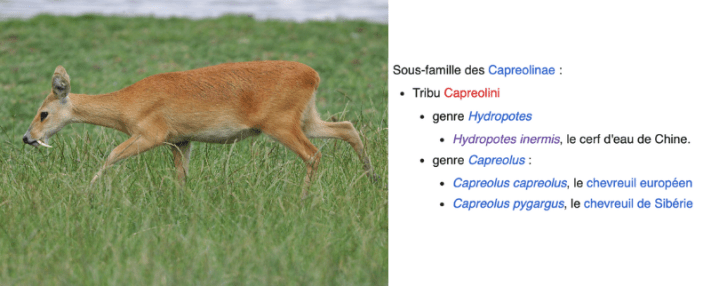 It too was imported from Asia. As with the muntjac, some have escaped and spread. This is a very timid animal that likes wetlands (hence its name). It measures around 50 cm at the withers and weighs between 10 and 15 kg. It is the only member of the cervidae family not to have antlers. It does, however, have two prominent canine teeth, which it uses in combat.