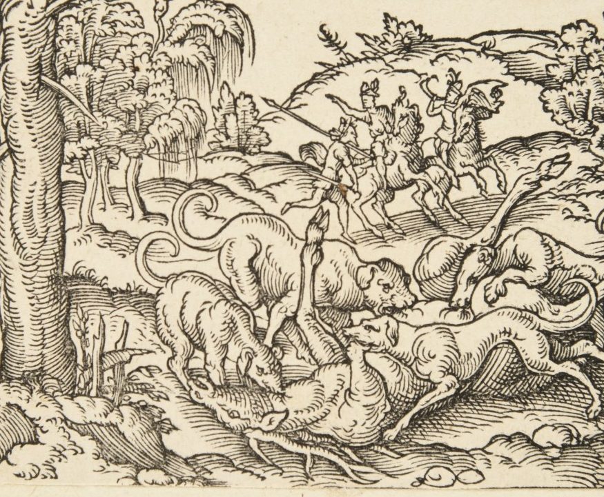 Actéon s’enfuit alors dans la profondeur des bois. Dès que la meute eut reniflé l’animal sauvage elle le prit en chasse puis l’ayant rejoint les chiens se jetèrent sur lui et le mirent en pièces.