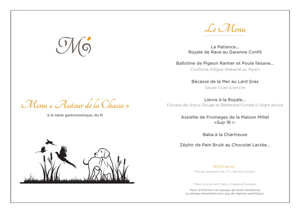 Avec l’arrivée de l’automne, Sébastien Nouveau a concocté un menu rendant hommage au gibier et à la chasse. Il insiste sur le fait que le gibier servi à sa table est sauvage ; c’est un chasseur du Luberon qui l’approvisionne en lièvres, perdrix et pigeons. Lui-même n’est pas chasseur mais apprécie le travail du gibier et surtout du petit gibier à poil ou à plumes. Vous noterez que le menu remercie Viktor, le chasseur grâce à qui les gourmets peuvent se régaler.