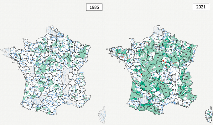 Les prélèvements de cerfs sont aussi en hausse importante puisqu’on constate une augmentation de 7,1% par rapport à l’année dernière. Depuis 20 ans, les prélèvements de cerfs ont été multipliés par 2,2. Le nombre d’animaux est important mais il faut aussi prendre en compte que sa répartition géographique est en constante expansion comme le montrent ces deux cartes qui permettent de mesurer l’évolution de la présence du cerf en France.