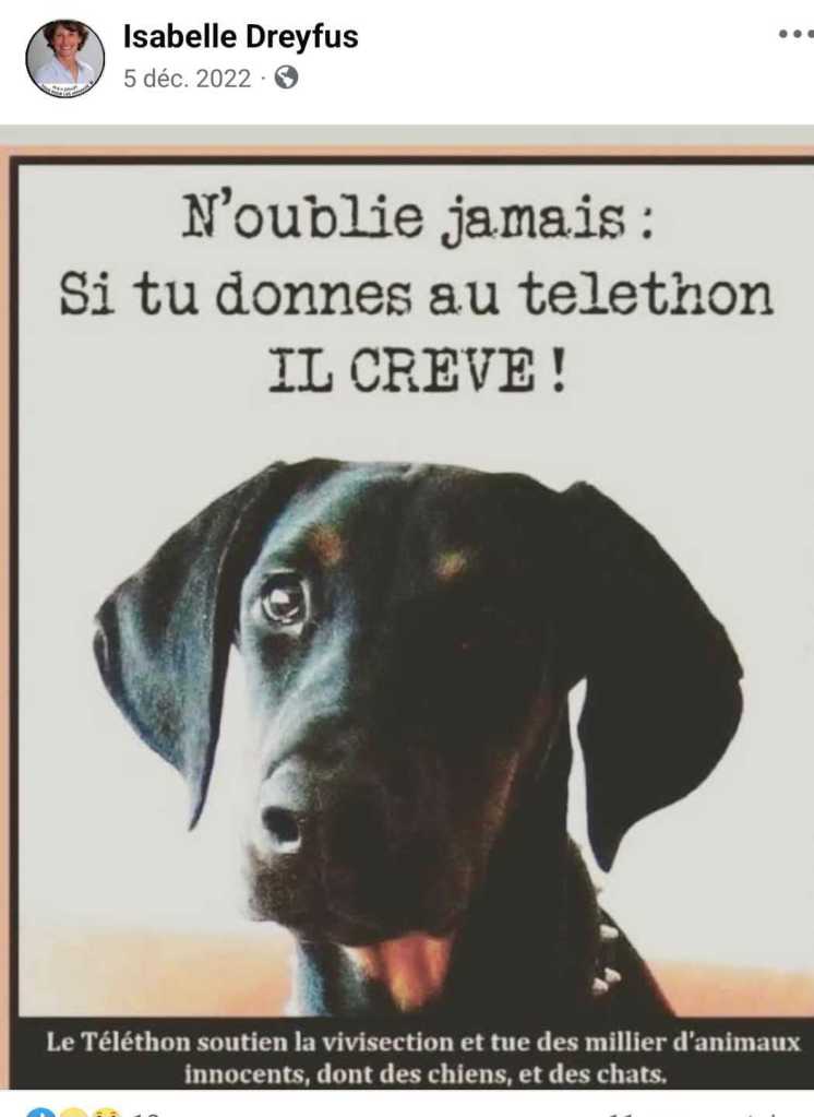 C’est une anti-chasse revendiquée. La page Facebook de la dame est édifiante, non seulement elle est anti-chasse mais elle s’oppose aussi à la recherche médicale comme vous pourrez le voir ici. Bref, nous avons à faire à une militante anti-spéciste radicale. Elle est membre de Futur Asso, une association anti-chasse virulente, proche de One Voice, qui n’hésite pas à utiliser mensonges, provocations et manipulations pour assoir sa propagande.