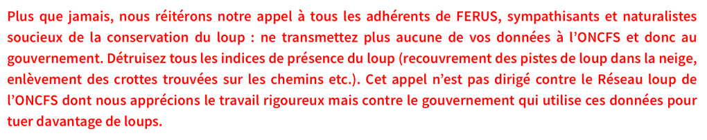 L’OFB déclare que la méthode est basée sur la participation « de partenaires multiples tels que des professionnels (OFB, espaces naturels, forestiers, technicien des fédérations de chasse) ou de bénévoles volontaires (chasseurs, naturalistes, agriculteurs). » Et c’est là que le bât blesse car les « naturalistes » volontaires sont en général issus des rangs des pro-loups qui minimisent intentionnellement les indices de présence et déclarent clairement ne pas vouloir les transmettre4 car ils permettent d’évaluer la population globale et donc de calculer le pourcentage de tirs légaux. Voici ce que l’on peut trouver sur le site internet de Ferus.