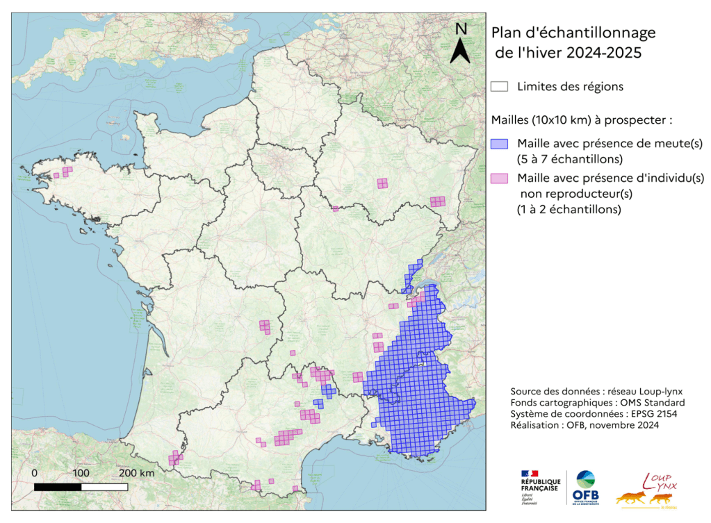 Les zones de recherche d’indices génétiques sont trop limitées et ne couvrent pas toutes les zones où des loups sont présents et actifs ! Voici les zones retenues par l’OFB pour le comptage hivernal 2024-2025.