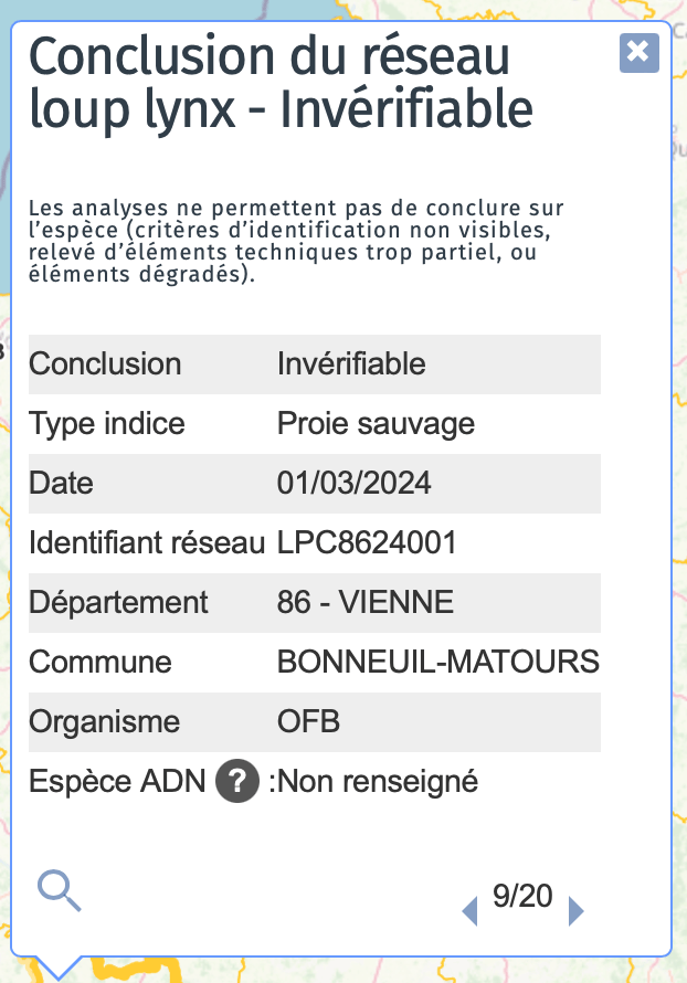 Seules 25% des analyses génétiques peuvent donner un résultat fiable car, dans la majorité des cas, les échantillons sont trop dégradés pour être pris en compte. Voici un exemple issu de la carte du réseau loup-lynx.
