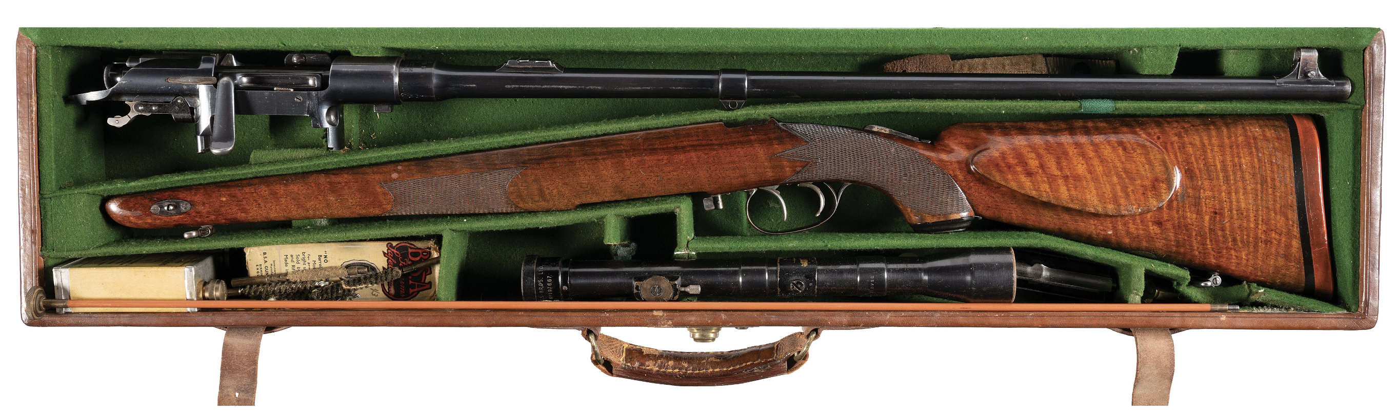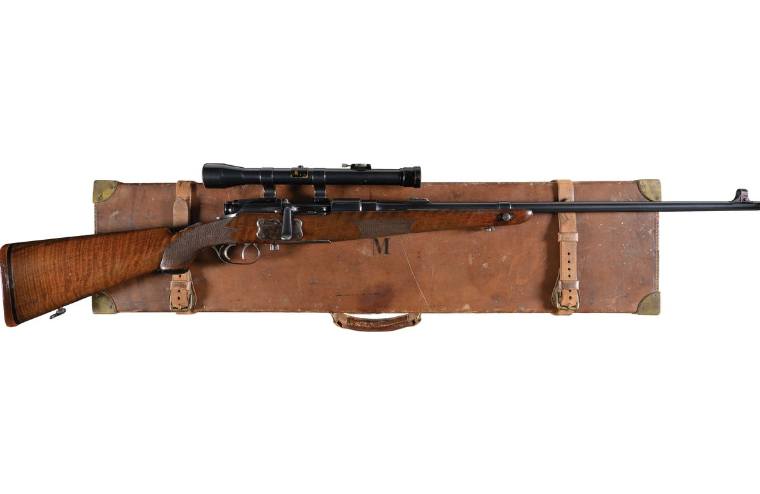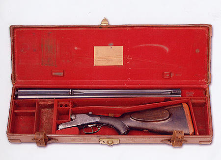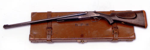 Ci-dessous, ses deux armes favorites, le fameux double express en .450 NE fabriqué pour lui par l’armurier anglais Charles Lancaster en 1925 et une carabine Mannlicher-Schoenauer/George Gibbs, modèle 1905 en calibre .256 Gibbs Magnum.