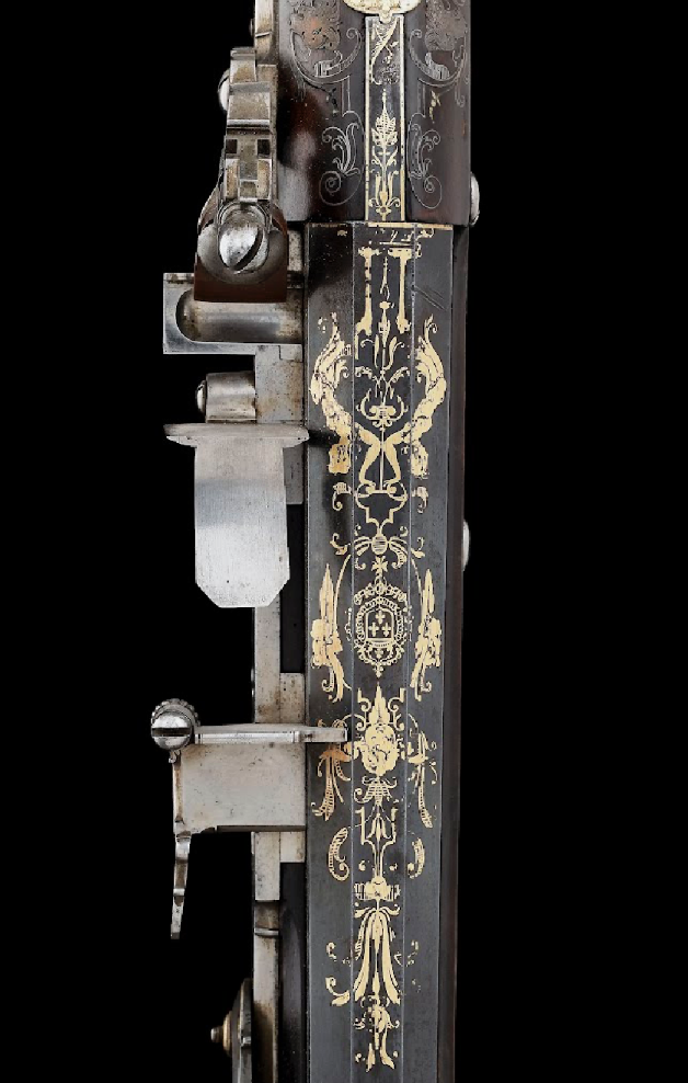 Ce superbe fusil faisait partie du cabinet d’armes de Louis XIII. Passionné de chasse et de technique, le roi Louis XIII s’était constitué un cabinet d’armes exceptionnel, regroupant des pièces venues des meilleurs arquebusiers du royaume, comme Le Bourgeois ou François Duclos.