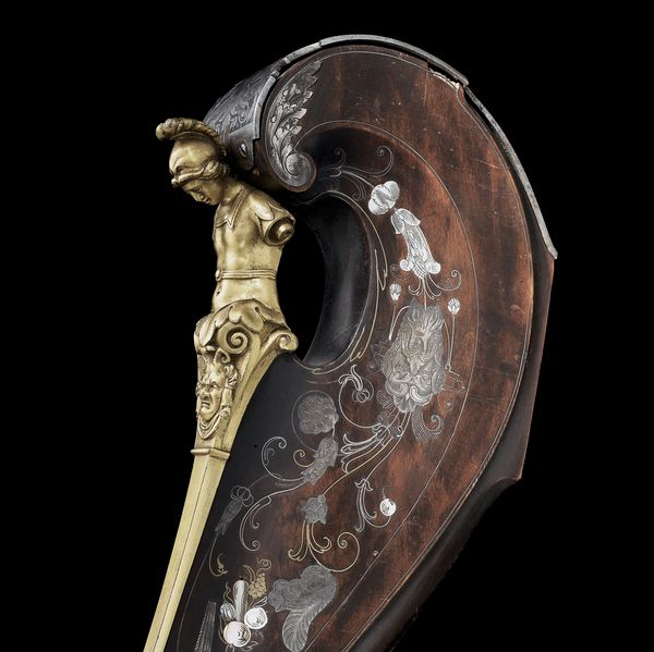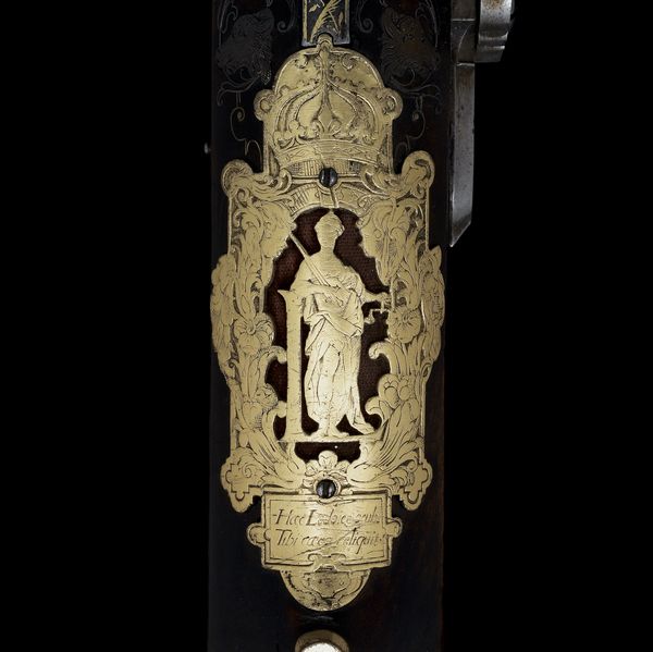 Voici quelques détails de cette arquebuse exceptionnelle. La crosse en volute est agrémentée d’un buste de Minerve en bronze. Une applique en laiton doré est fixée à proximité de la queue de culasse. Au centre de celle-ci une représentation de la Justice appuyée sur le » L » du souverain.