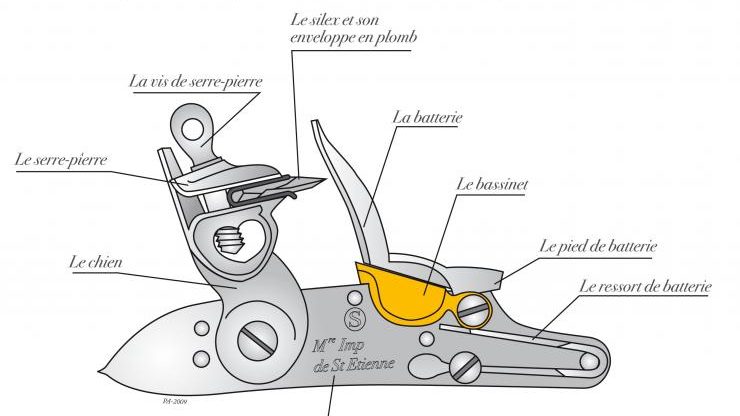 Le mécanisme à silex a été inventé par l’arquebusier Marin Bourgeois en combinant le système de deux platines existantes (à chenapan et à miquelet). A partir de 1630, ce mécanisme a progressivement remplacé les mécanismes plus anciens comme les platines à mèche ou à à rouet et sera utilisé pendant plus de 200 ans.