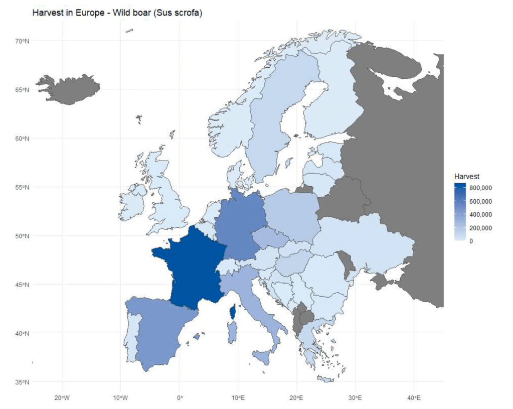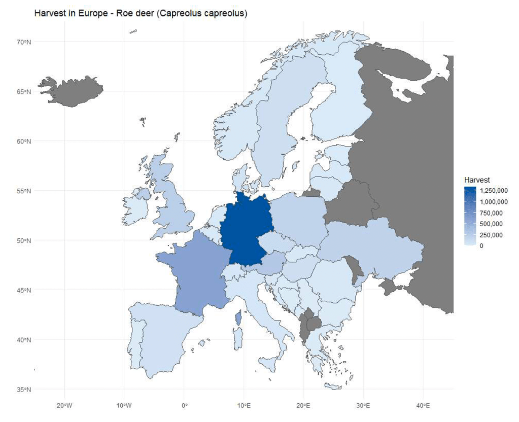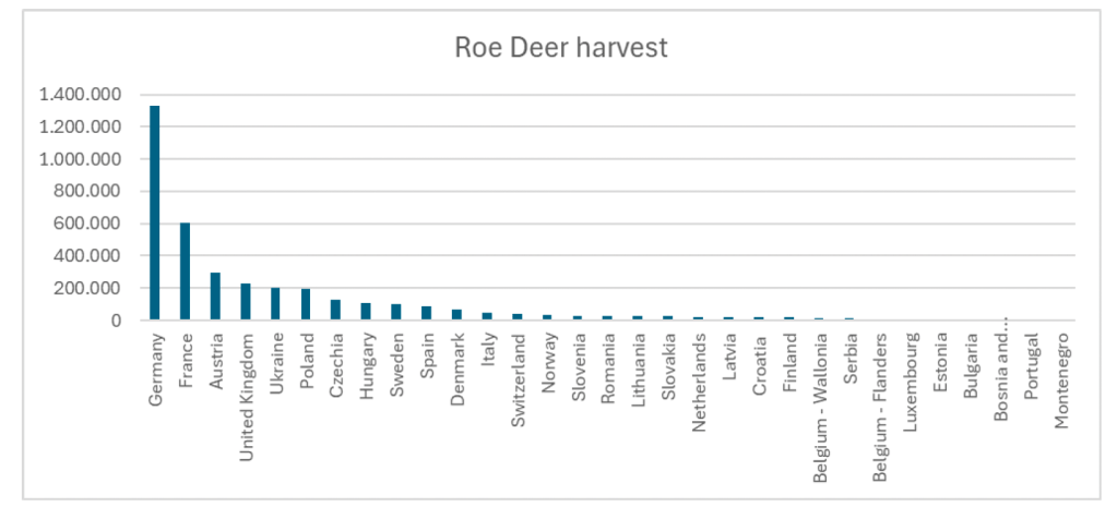 Chevreuil : espèce la plus répandue et la plus chassée en Europe (3,7 millions). L’Allemagne représente 35 % des prélèvements totaux avec 1,3 millions d’animaux.