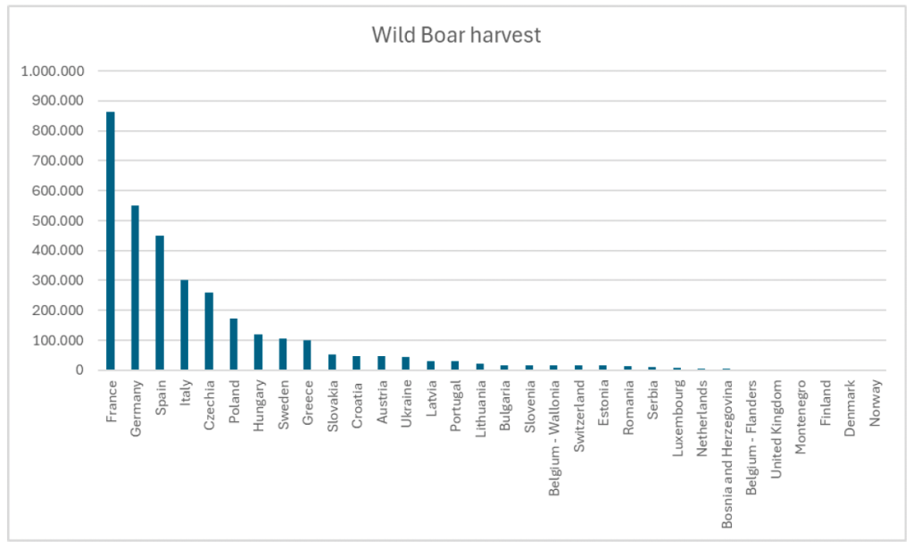Sanglier : deuxième espèce la plus chassée (3,3 millions). C’est la France qui arrive en tête avec un chiffre de 860 000.