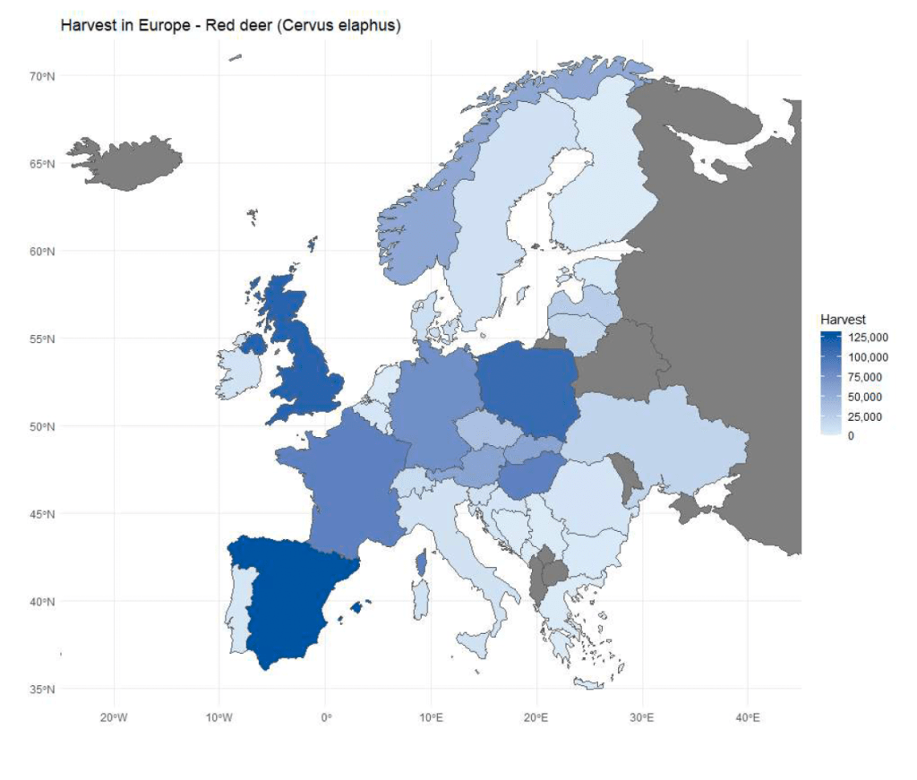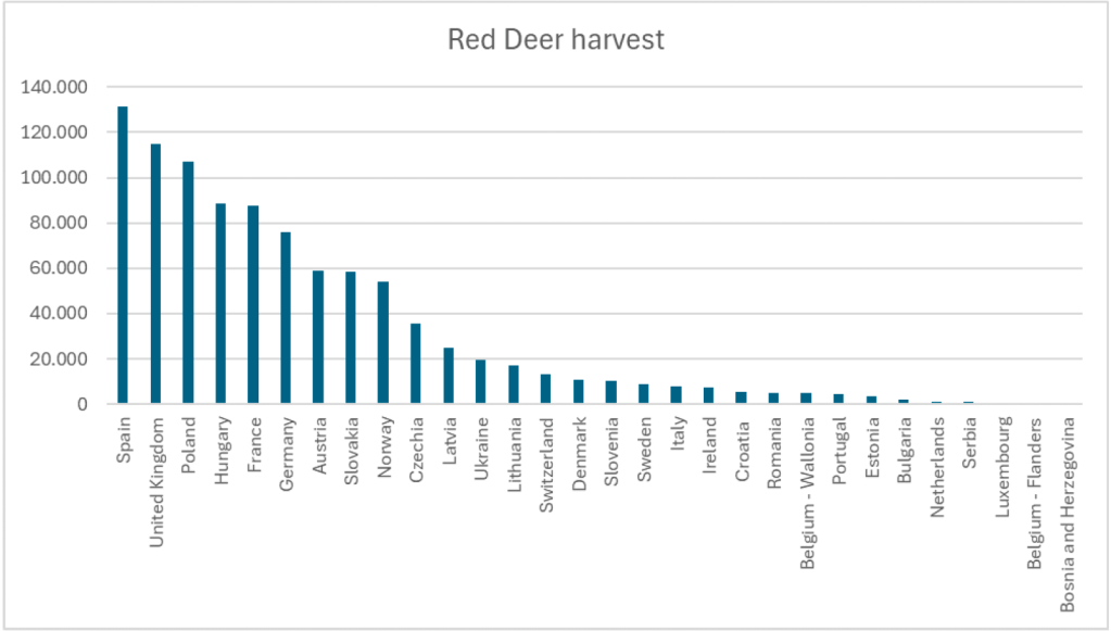 - le cerf élaphe est le troisième grand gibier le plus chassé en Europe avec un total d’environ 1 million d’animaux et que c’est en Espagne qu’ont lieu les plus gros prélèvements de cette espèce.