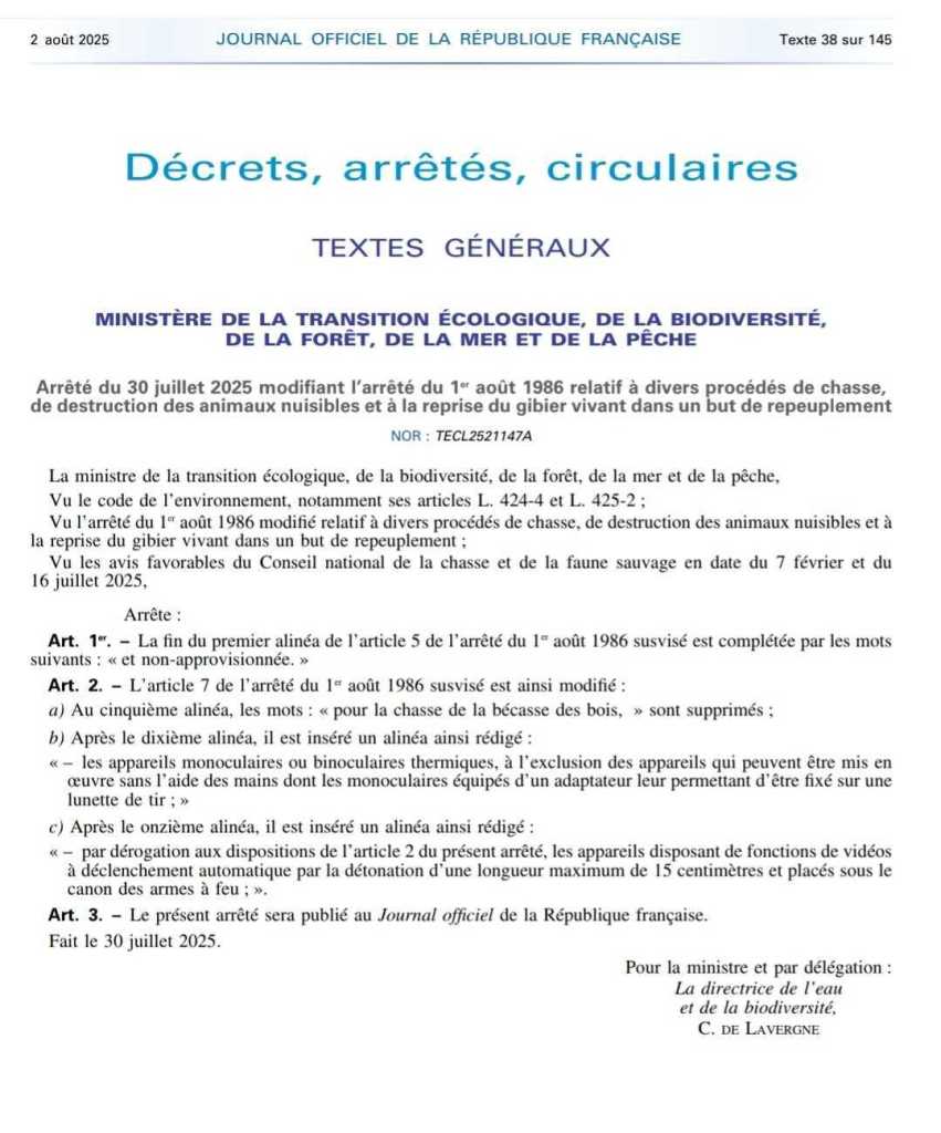 L’article 7 de l’arrêté de 19861 qui définit la légalité de certains moyens d’assistance électronique à la chasse est profondément modifié par celui du 30 juillet 2025 puisque de nouveaux équipements sont maintenant autorisés.
