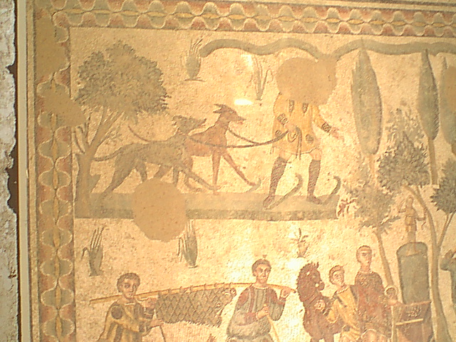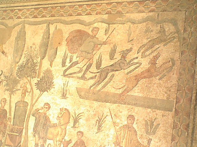 Cette grande mosaïque nous permet de constater que nos gibiers d’aujourd’hui étaient prisés par les romains de l’antiquité, sangliers, cerfs, lièvres, renards, oiseaux divers sont représentés. Nous voyons aussi que les romains utilisaient beaucoup les chiens de chasse.