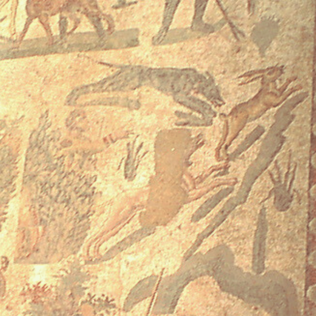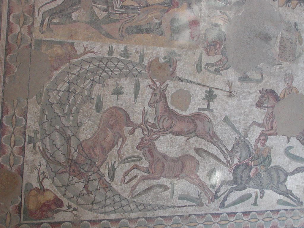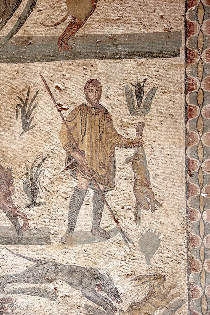 Les romains chassaient comme nous, lapins, lièvres et divers oiseaux. La chasse au lapin (ou lièvre) est bien présentée avec trois mosaïques. L’une montre un chasseur en tenant un mort, une autre un chasseur lançant deux chiens à sa poursuite et la troisième dépeint un chasseur à cheval essayant d’en attraper un avec une sorte de trident.