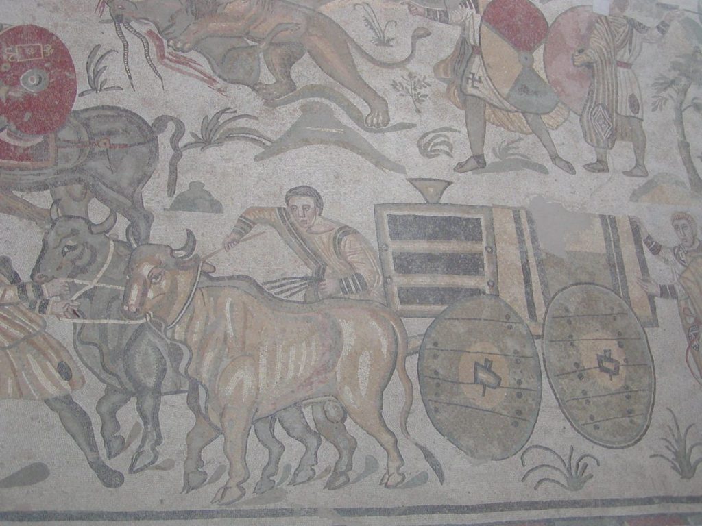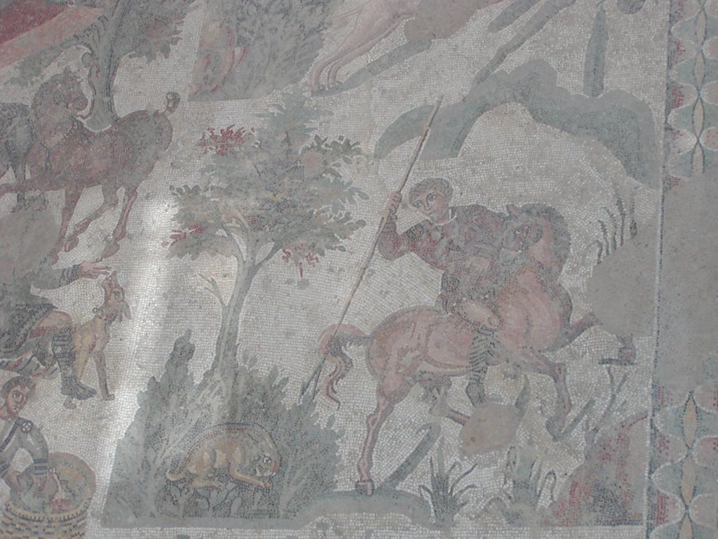 La seule certitude raisonnable que nous puissions avoir au sujet du propriétaire est qu’il s’agissait d’un homme riche et puissant, probablement membre de la classe sénatoriale ou de la famille impériale qui possédait des propriétés en Afrique. Les mosaïques nous apprennent qu’il gagnait de l’argent en capturant des animaux sauvages pour les venationes1 au Colisée ; qu’il aimait la chasse ; la musique et la poésie.