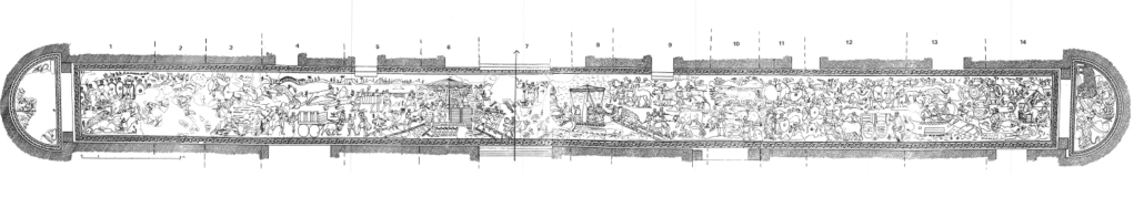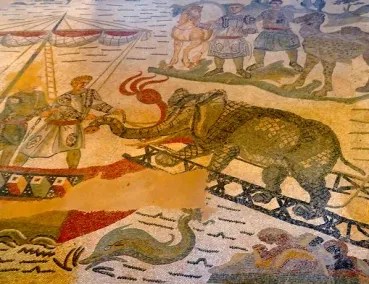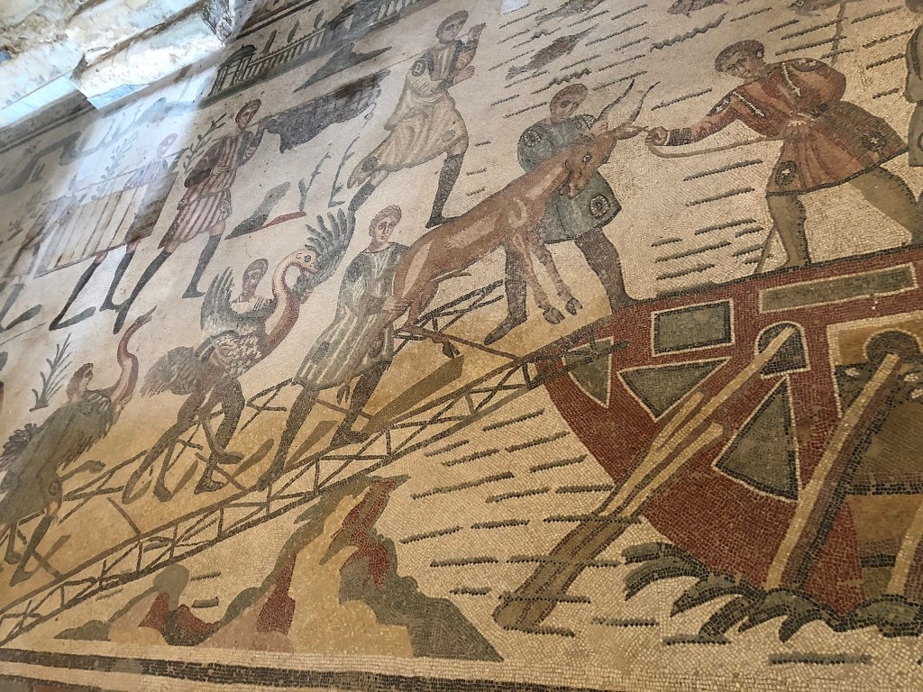 Ce long couloir (66 mètres) est décoré de mosaïques qui représentent la capture d’animaux sauvages dans les zones les plus reculées de l’empire (Afrique, Asie…) et leur transport par bateau pour le cirque de Rome.