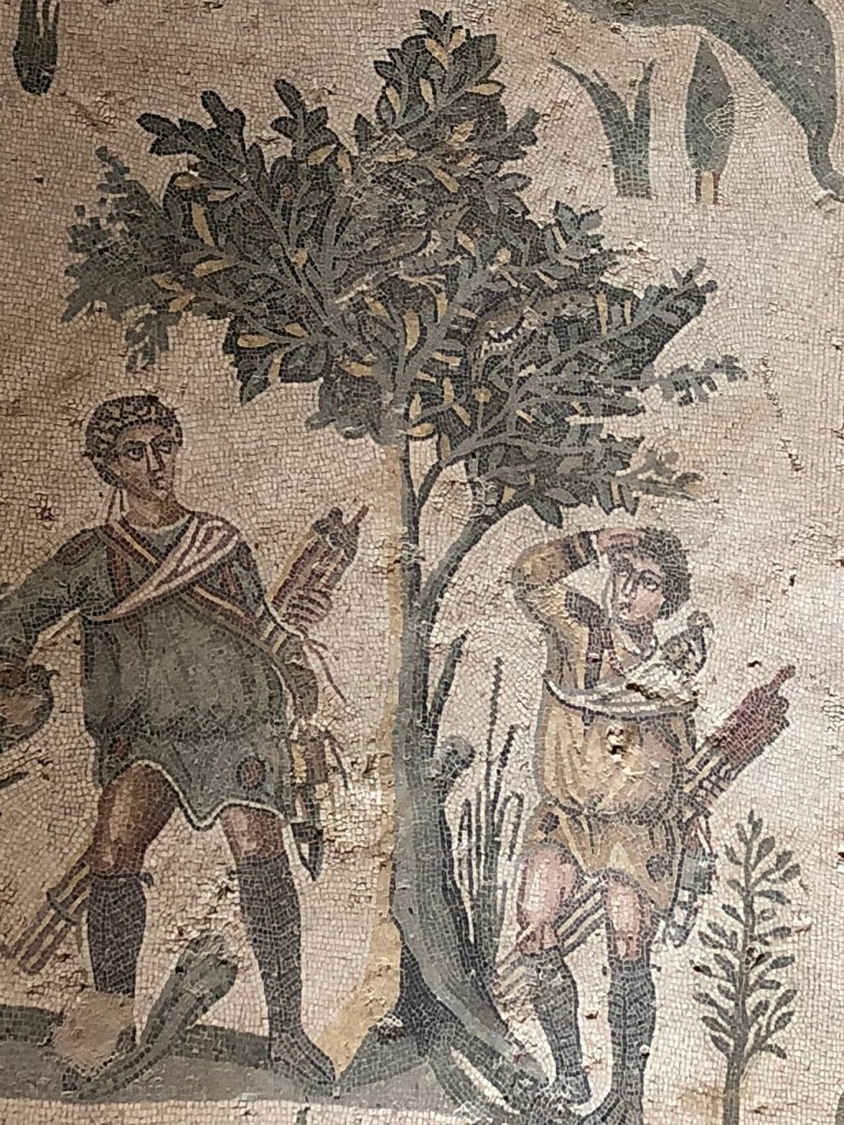 La chasse aux oiseaux n’est pas oubliée. Sur une des mosaïques on peut voir deux chasseurs en train de se préparer pour la chasse à la glu. Ils ont leurs baguettes dans les mains et sont au pied d’un arbre sur lequel on distingue deux grives. A cette époque antique l’oiseleur est admiré par les romains pour sa grande ingéniosité (usage de la glu, de pièges, de filets et de rapaces), pour sa ruse (utilisation d’appeaux et d’appelants) et pour l’adresse que sa chasse requiert.