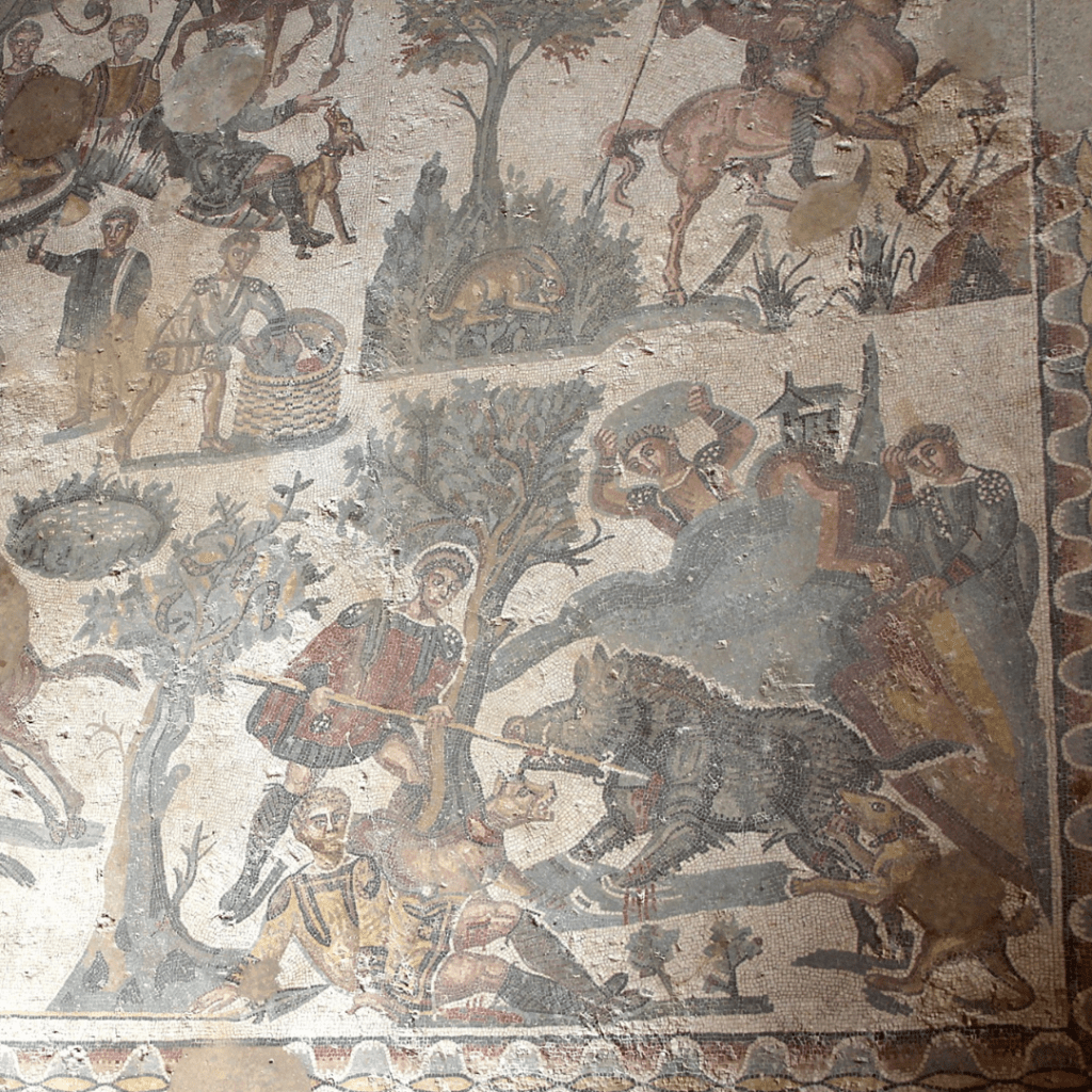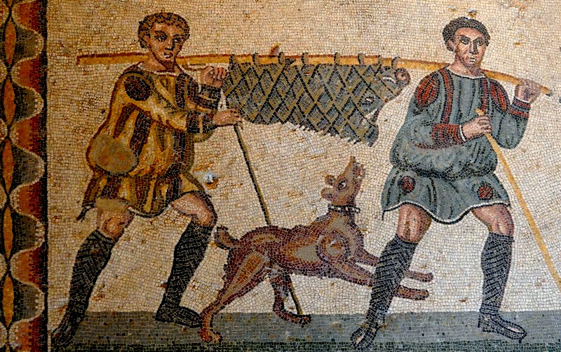 Pour les romains, la chasse noble par excellence est celle du sanglier, qu’ils pratiquent à pied ou à cheval, avec l’épieu pour arme. Le sanglier, est donc présent dans cette mosaïque. On y voit la mort de l’un d’eux transpercé par un épieu mais il semble qu’il ait auparavant blessé à la cuisse un chasseur que l’on voit allongé au sol. Puis une autre scène nous montre deux hommes qui transportent le sanglier attaché à un pieu à l’aide d’un filet. On peut noter un chien agité qui court sous le sanglier, en manifestant un vif intérêt pour celui-ci.