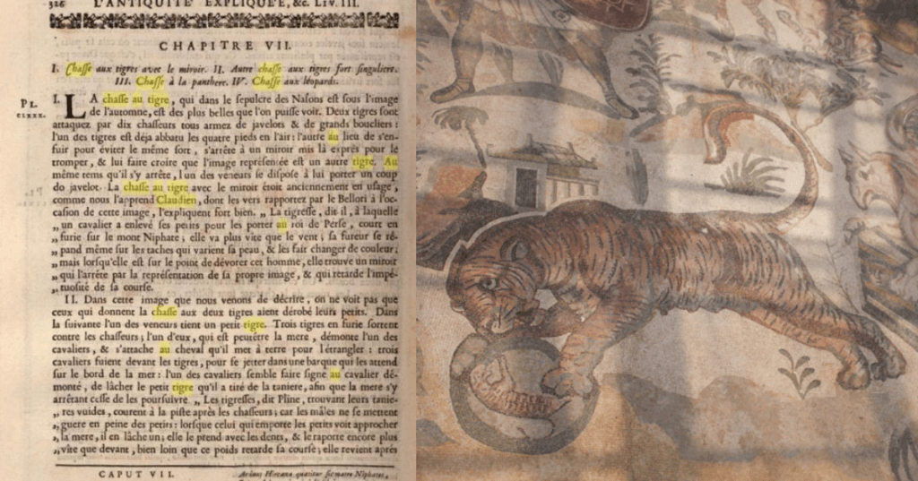 Plus à droite, une scène représente une technique indienne de capture de tigre décrite par des auteurs de l’époque. Une boule de cristal faisant miroir est lancée devant la tigresse qui, croyant voir un de ses petits, se précipite pour le sauver. Pendant ce temps, le chasseur s’enfuit avec la portée. Est-ce une technique réelle ou est-elle issue de l’imagination des auteurs de l’époque ? Nul ne le sait mais elle est rapportée par des historiens et des poètes comme Claudien.