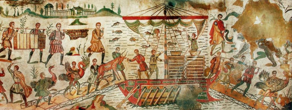 Les scènes suivantes montrent le transport des animaux dans une charrette tirée par des bœufs et leur embarquement dans des bateaux à destination du port d’Ostie, près de Rome.