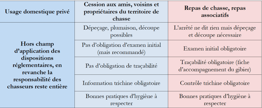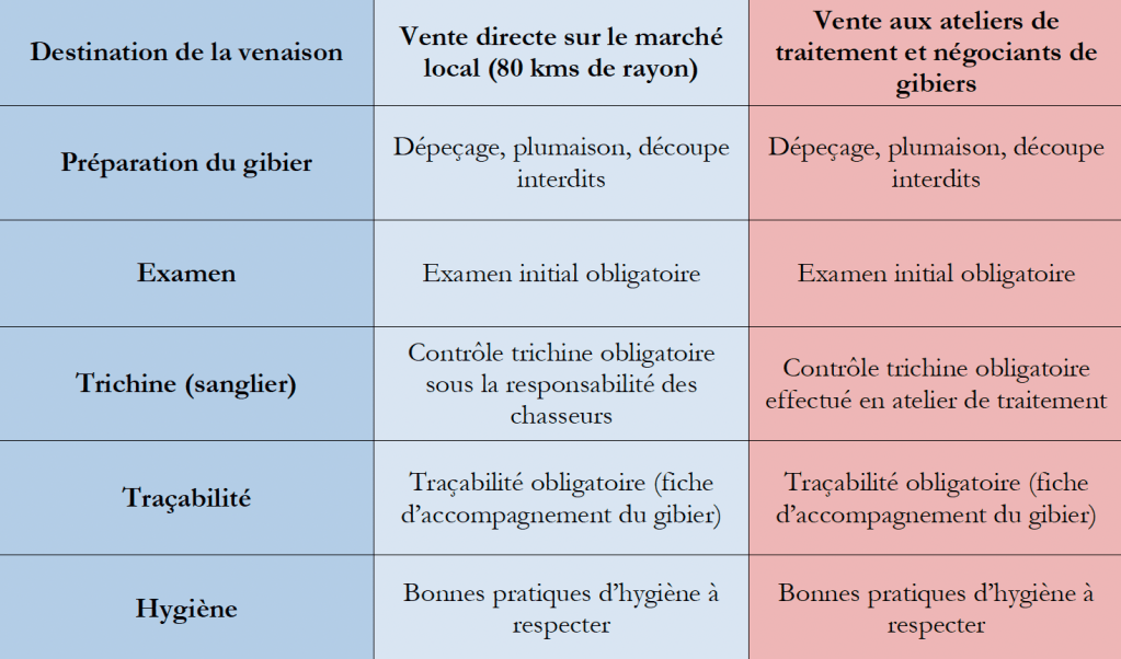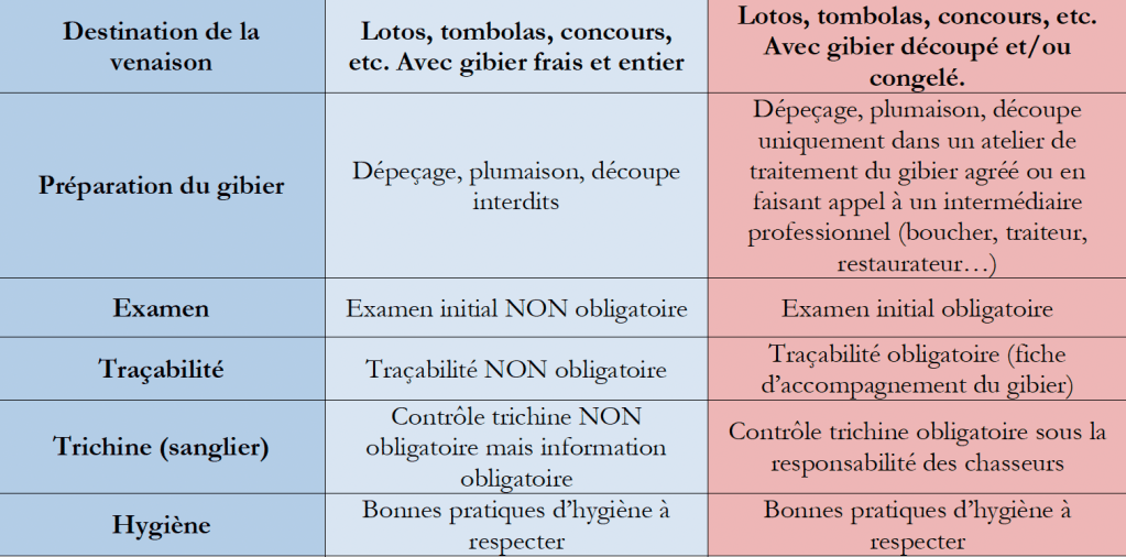 Ces trois tableaux résumant la réglementation sont issus d’une note d’information relative à l’hygiène de la venaison, à sa préparation, à sa cession et à l’enfouissement des déchets de la fédération départementale des chasseurs du Lot et Garonne.