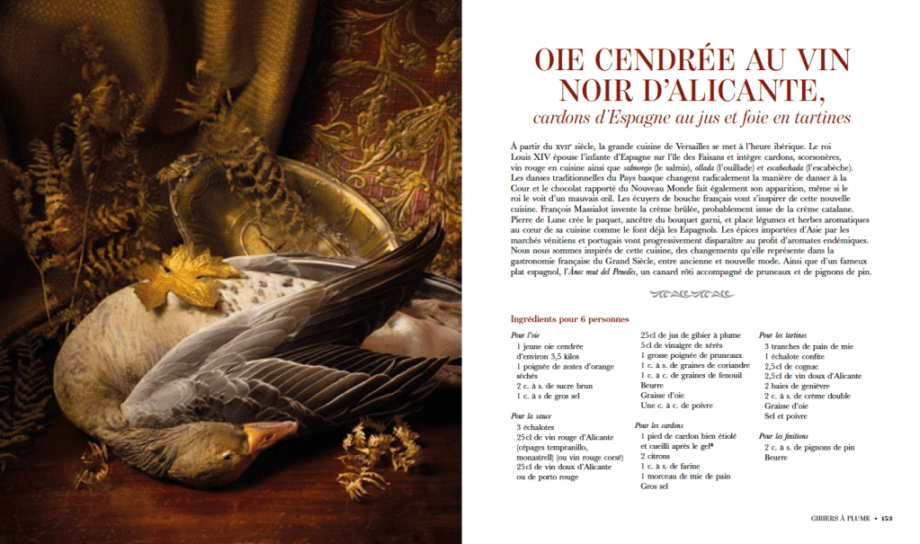 Chaque recette est liée par les auteurs à une époque, un personnage historique et un terroir. Le choix du gibier n’est pas anodin. Qu’y a-t-il de plus enraciné que le gibier, sa chasse et sa cuisine qui invite au partage et à la célébration de ce que la nature nous offre si on la respecte.