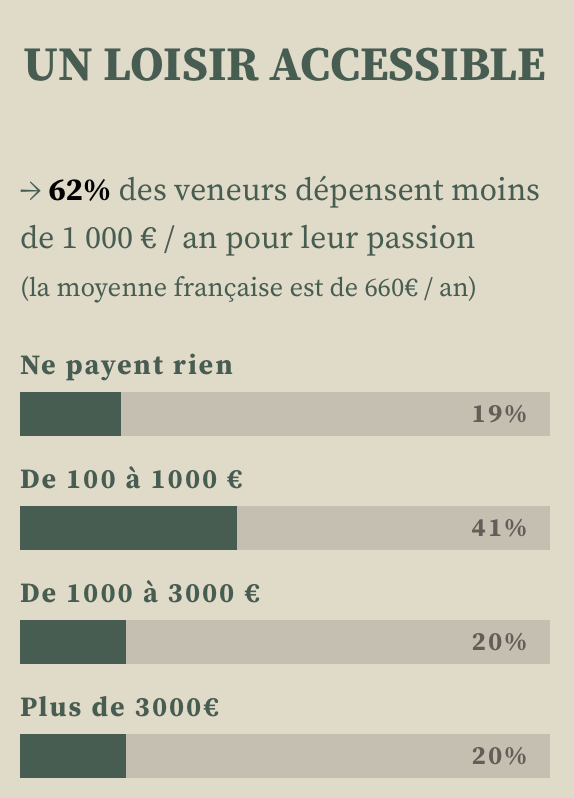 « 62% des veneurs dépensent moins de 1.000 € par an pour leur passion. C’est le montant du budget moyen que les Français consacrent à leurs loisirs. » (Source : société de vénerie)