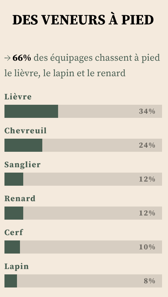 « La vènerie la plus répandue est celle du lièvre (34%) qui se pratique à pieds, suivie de celle du chevreuil (24%) puis du sanglier (12%). La chasse à courre du cerf ne représente que 10% des équipages en France. » (Source : société de vénerie)