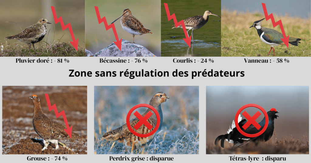 - Dans l’ensemble, on a observé un déclin considérable des populations d’oiseaux menacés tels que le pluvier doré, le courlis et la perdrix grise dans les zones où les prédateurs ne sont plus régulés.
