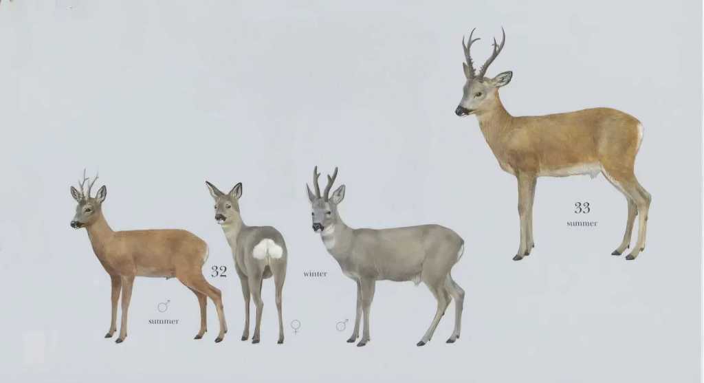 Le pelage du chevreuil de Sibérie présente des variations de couleur et de taille de bois selon la saison. En hiver, il est principalement taupe, avec des nuances blanc crème sur le ventre. En été, sa couleur taupe vire à un rouge orangé plus vif, tandis que son ventre reste crème.