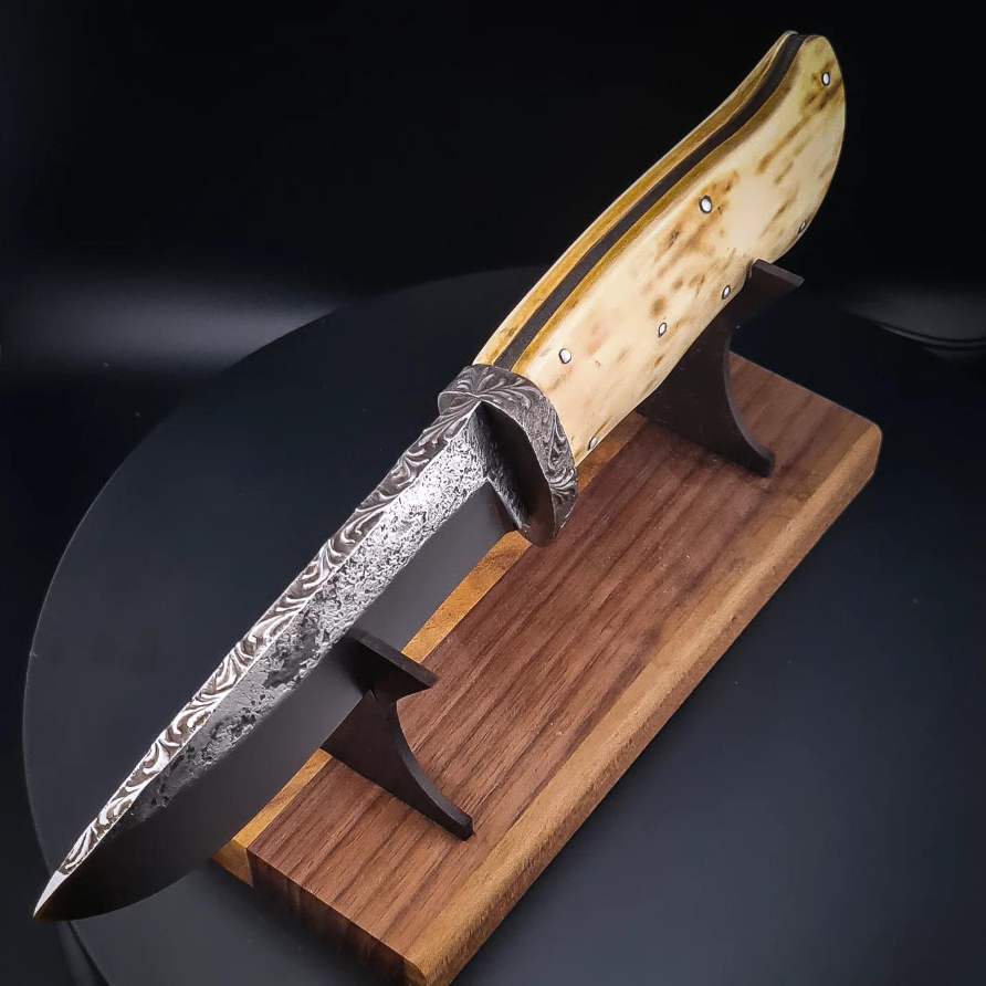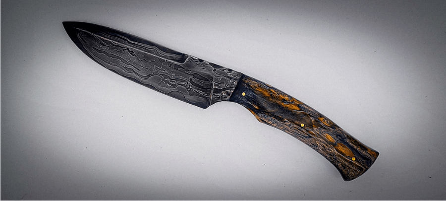 Couteau en damas de chaînes de tronçonneuse, plate semelle, manche en peuplier stabilisé