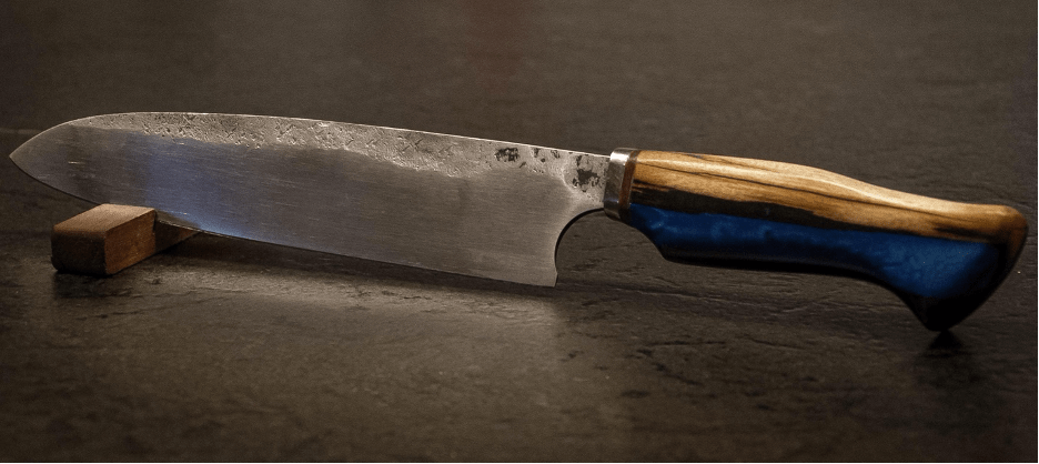 Couteau de chef, acier simple 90MCV8, brut de forge, émouture haute, manche en ébène royal et résine époxy bleu nacré