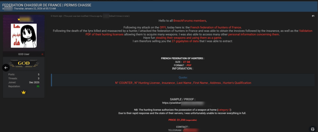 Permis de chasse 27 Go de données vendus sur BreachForums (22 janvier 2026) motif revendiqué : vengeance suite à la mort d’un lynx tué par un chasseur.