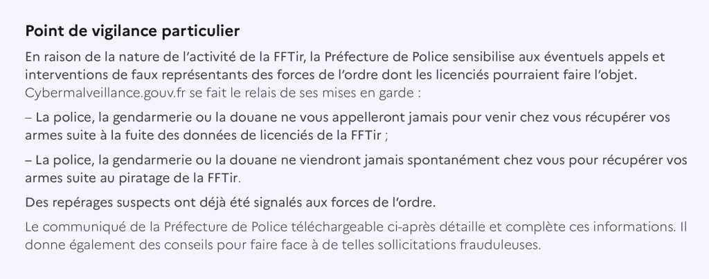 Le piratage de la base de données des adhérents de la Fédération française de tir en octobre 2025 avait été considéré comme suffisamment sensible pour que les services de l’État diffusent le message suivant :
