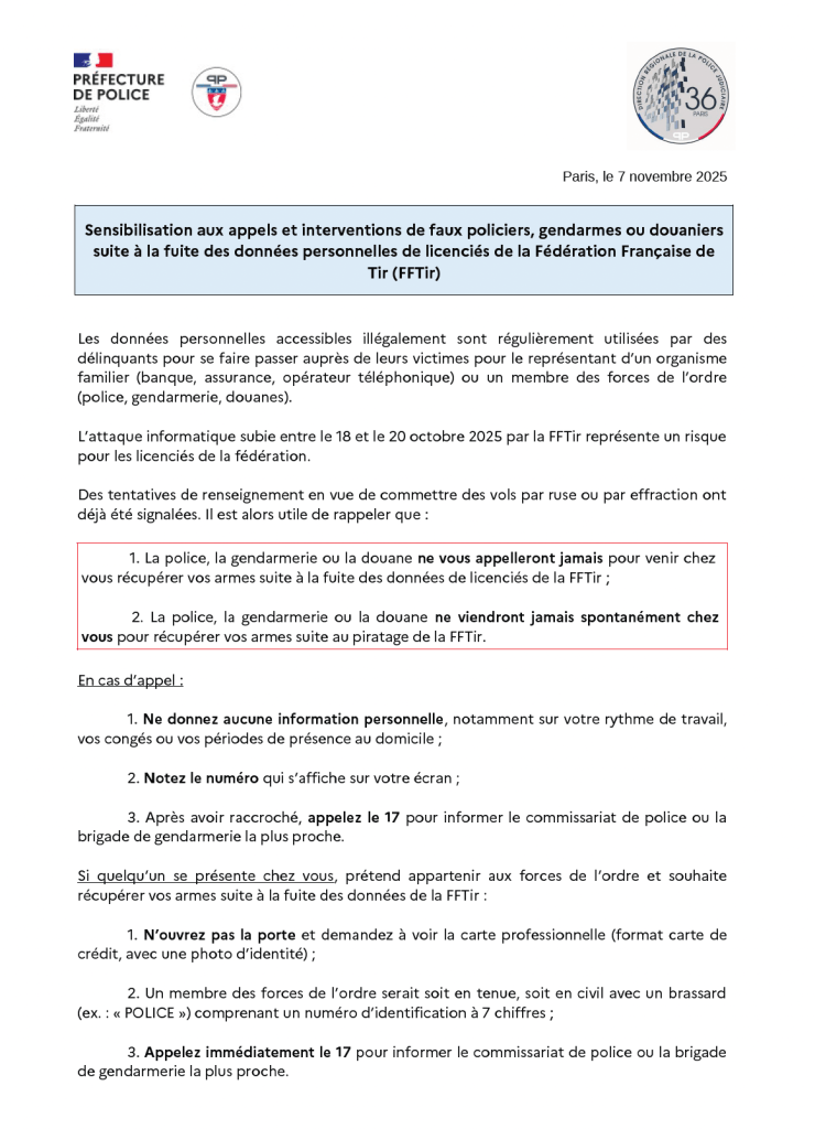 Ne laissez pas pénétrer chez vous des personnes se présentant comme policiers, gendarmes ou agents des douanes qui viendraient « vérifier vos armes et leurs conditions de stockage ». Les recommendations de l’État après le piratage de la F.F. Tir peuvent s’appliquer dans ce cas présent. : Violation de données personnelles de la Fédération Française de Tir : situation, risques et recommandations