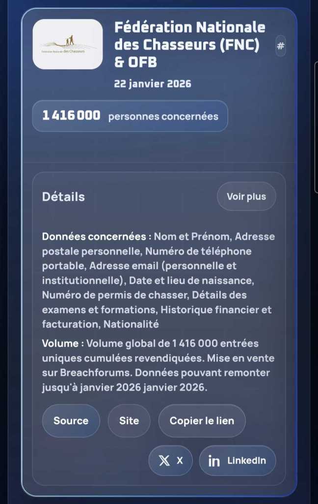 Cette Breach est relativement critique. Si vous avez un permis de chasse → vigilance maximale : surveillez mails/SMS suspects, changez mots de passe espaces adhérents, activez 2FA (activation à 2 facteurs) partout.